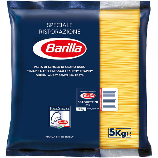 Ζυμαρικά Barilla Spaghetti No3. Με τον κλασικό, λεπτό σχεδιασμό τους, τα Spaghetti No3 είναι ιδανικά για να δημιουργήσετε γεύματα που ξεχωρίζουν. Από παραδοσιακές σάλτσες ντομάτας και μπολονέζ μέχρι ελαφριές συνταγές με λαχανικά ή πιάτα με θαλασσινά, αυτά τα ζυμαρικά προσφέρουν τέλεια γεύση και υφή.