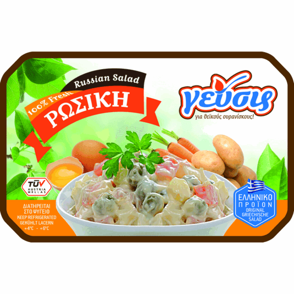 Ρώσικη Σαλάτα Γεύσις. Από φρέσκα λαχανικά, πατάτα, καρότο, αρακά και μαγιονέζα υψηλής ποιότητας. Αποτελεί το τέλειο συνοδευτικό για κρεατικά, ψάρια ή ως γευστικό ορεκτικό στο τραπέζι σας.